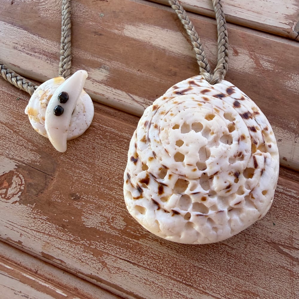 This spiral necklace features a rare large cone shell cap that measures 2 1/4 inches. It hangs on 22 inches of heavy hand braided artificial sinew. I can easily shorten this if you let me know before shipping. You can even see the kill hole towards the top left side where another creature drilled a hole. It is mermaid friendly (waterproof) and can be worn in the shower and the sea.