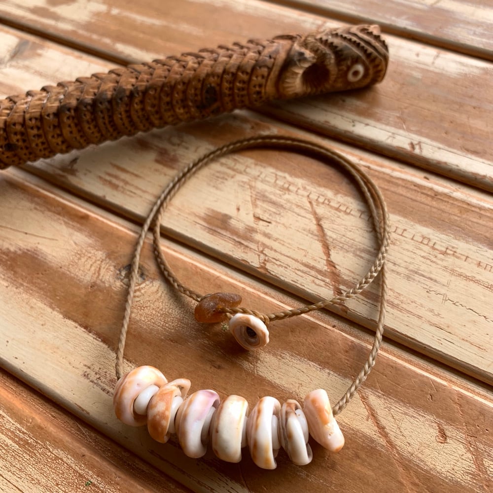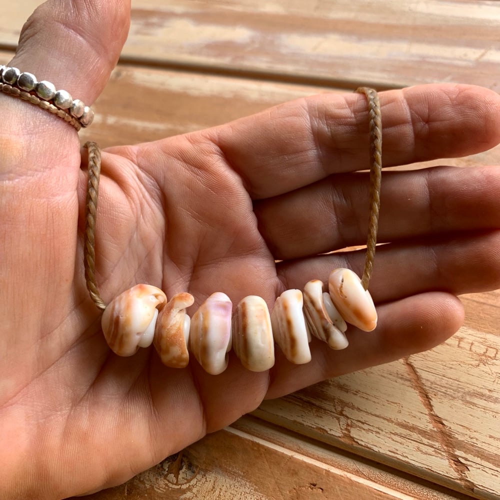 These golden puka shells are loaded with color and stripes. They remind me of butterscotch and chocolate swirls. They measure 5/8 inch by 2 1/2 inch and are separated by tiny white pukas. Strung on hand braided artificial sinew which makes it mermaid friendly (waterproof). It has my signature locking seaglass clasp.